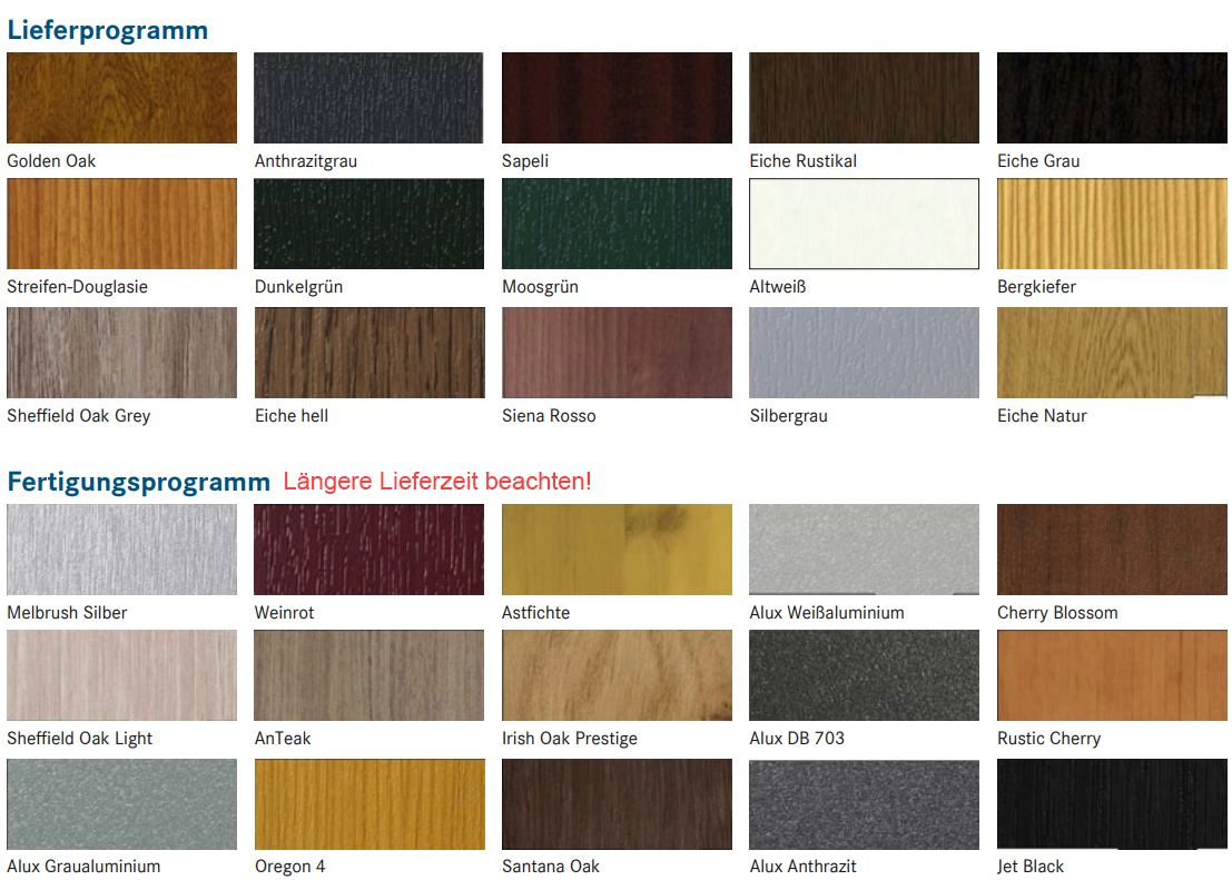 Hinsichtlich der Lieferzeiten unterscheiden wir zwischen zwei Programmen: Unser Lagerprogramm ist in der Regel innerhalb von 2–3 Wochen lieferbar. Darüber hinaus bieten wir ein Fertigungsprogramm an, bei dem mit längeren Lieferzeiten zu rechnen ist. Bitte berücksichtigen Sie dies bei Ihrer Planung.